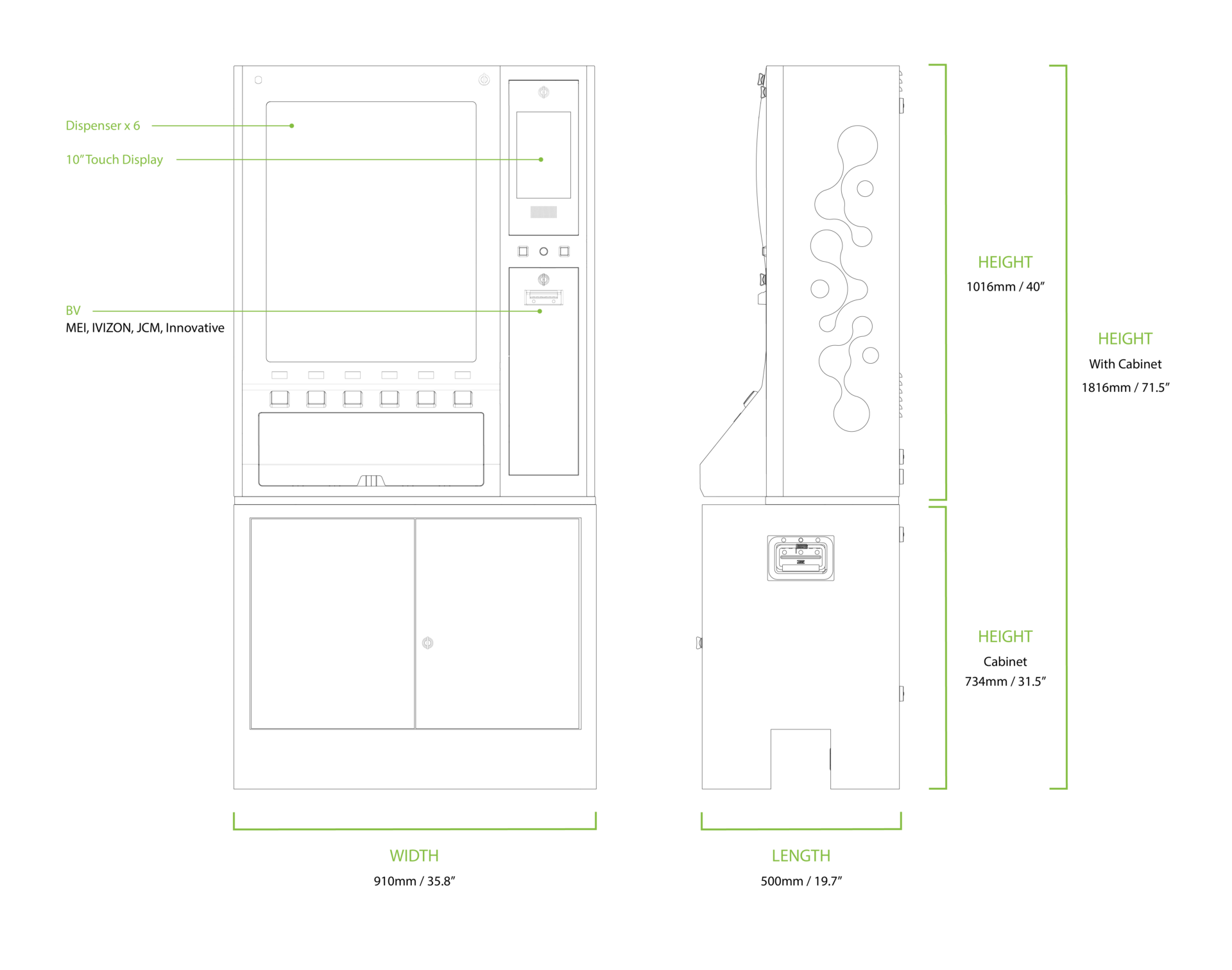 1000-note capacity. Optional bill recycler and thermal printer for receipts.